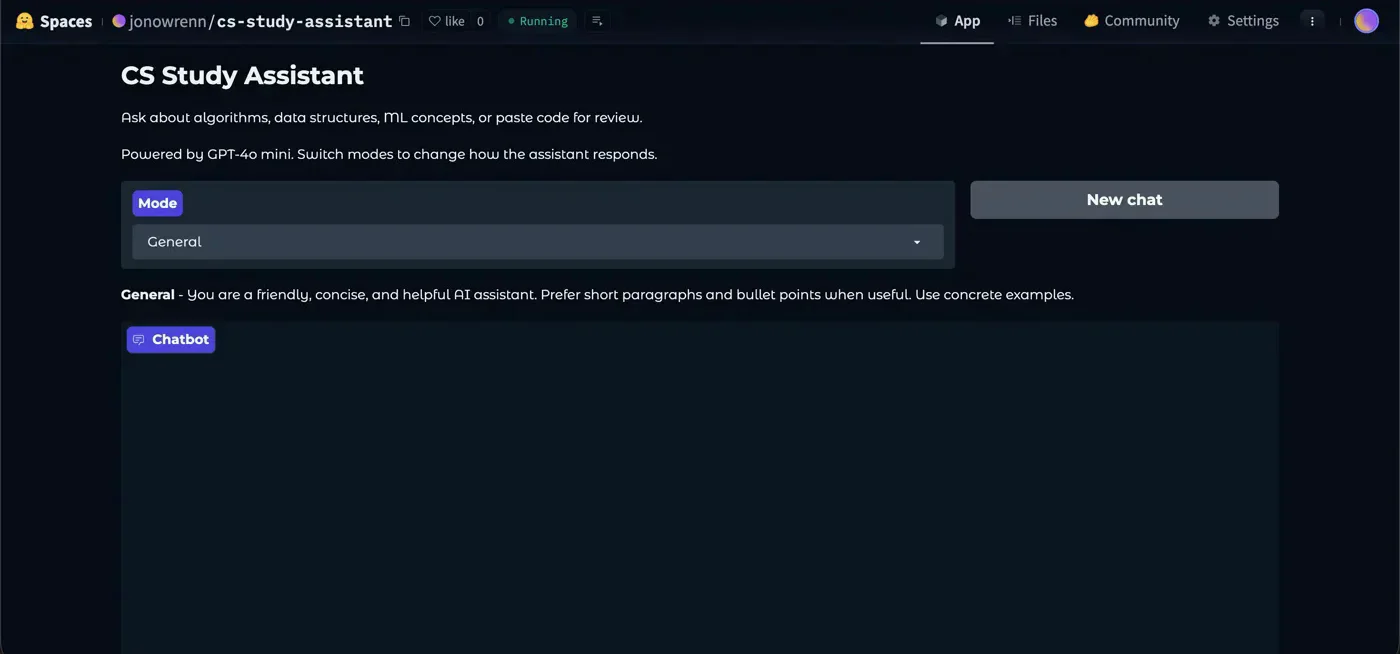 Multi-turn GPT chatbot with 6 expert modes (Code Review, ML Theory, Interview Prep, etc.), conversation memory, BYOK support, and deployed live on Hugging Face Spaces.